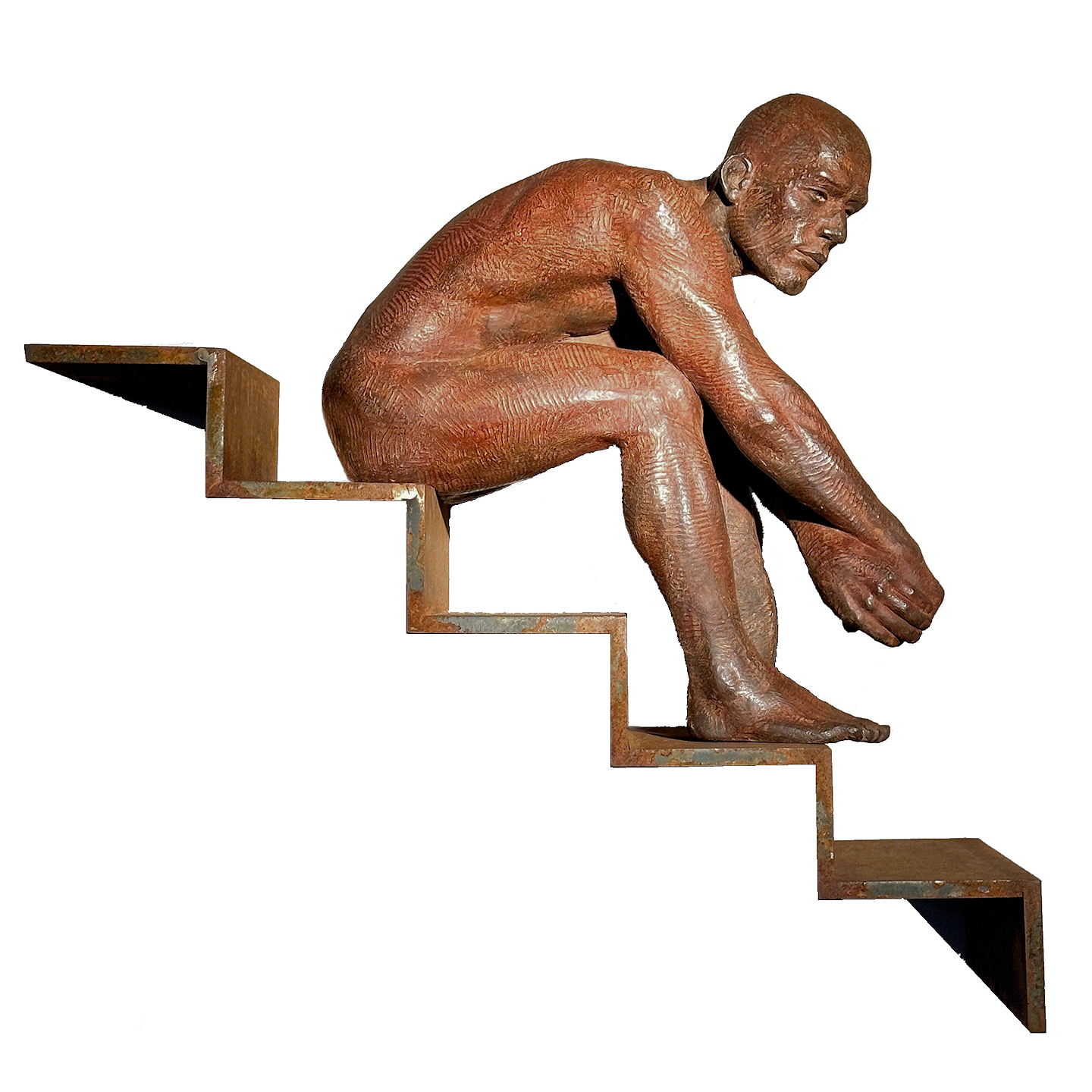 Muurbeeld bestaande uit een bronzen figuur op een cortenstalen trap.