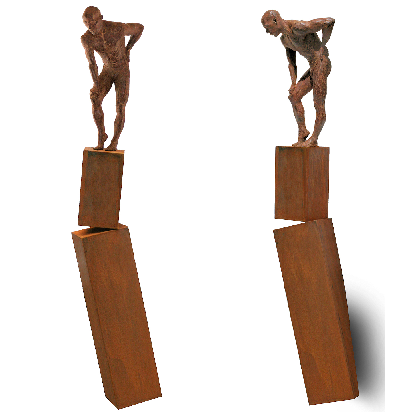 Muurbeeld van een bronzen figuur op een schuine sokkel van cortenstaal