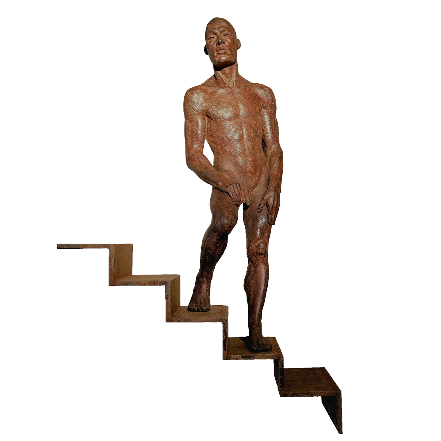 Muurbeeld bestaande uit een bronzen figuur op een cortenstalen trap.