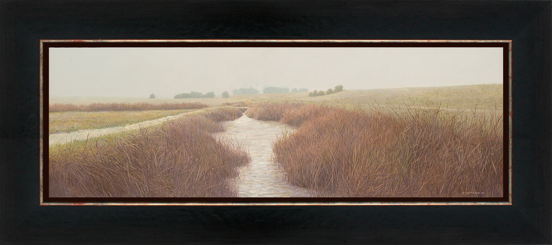 Het schilderij is 20 x 60 cm en voorzien van een zwarte houten baklijst met zilveren binnenrand. De totale afmeting is 30 x 70 cm