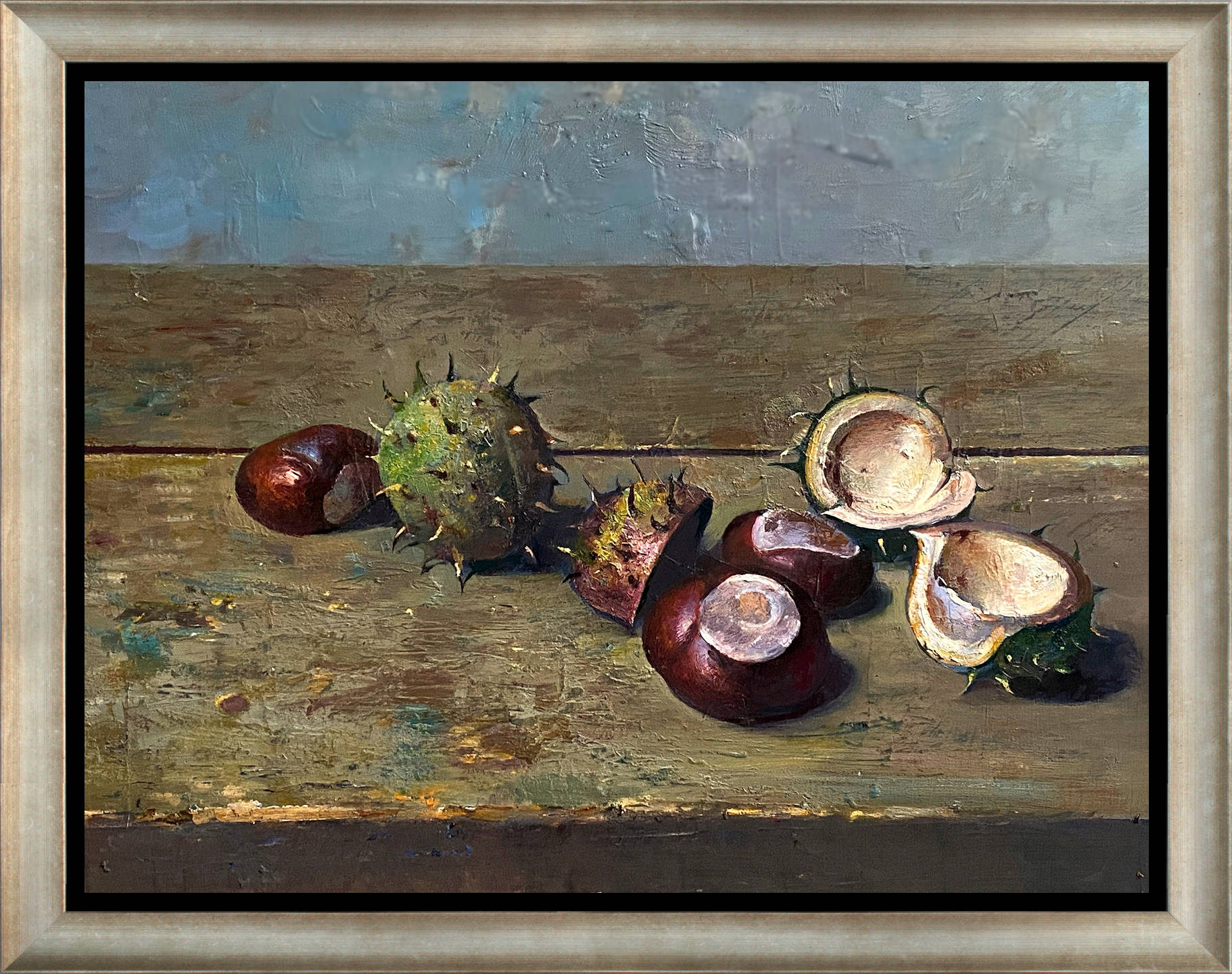 Het schilderij is 28 x 35 cm en voorzien van een zilveren houten baklijst. De totale afmeting is 40 x 47 cm