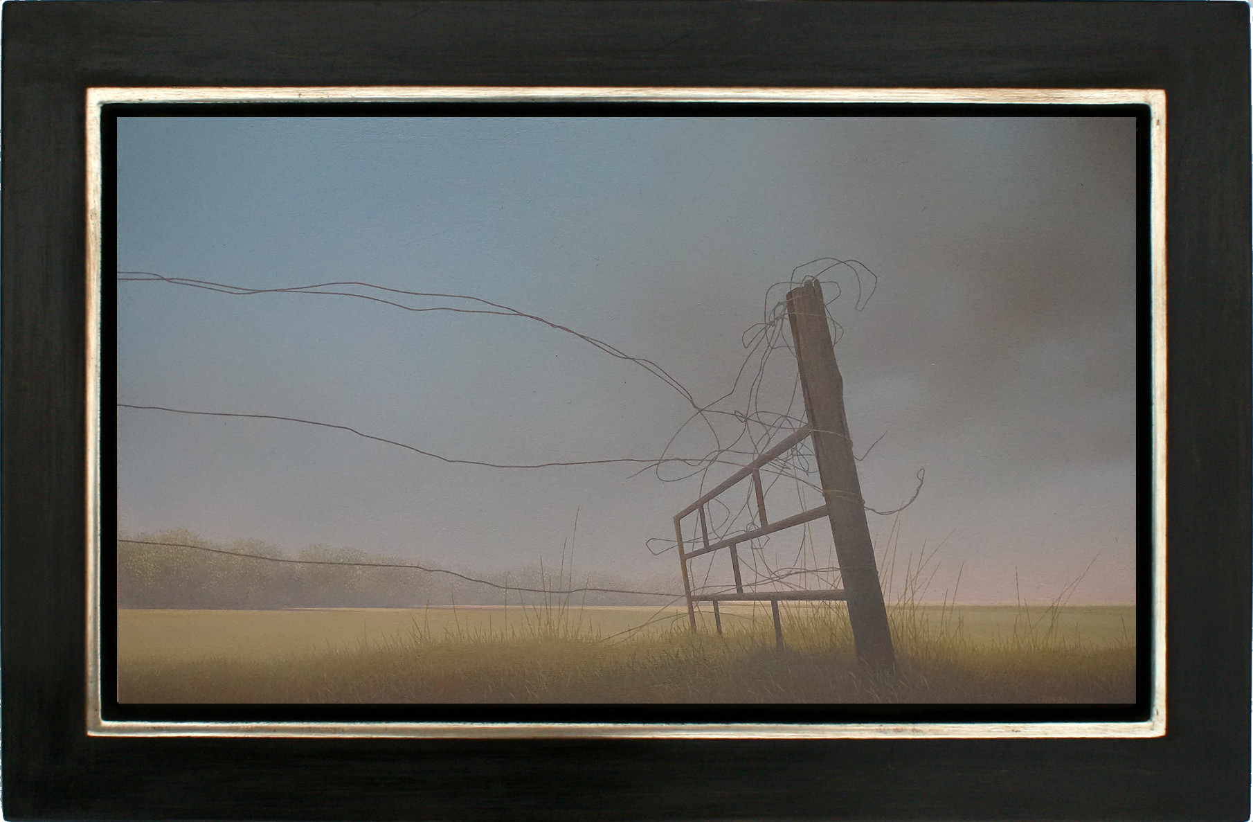 Het schilderij is 22 x 38 cm en voorzien van een zwarte lijst met zilver rand. De totale afmeting is 31 x 46 cm