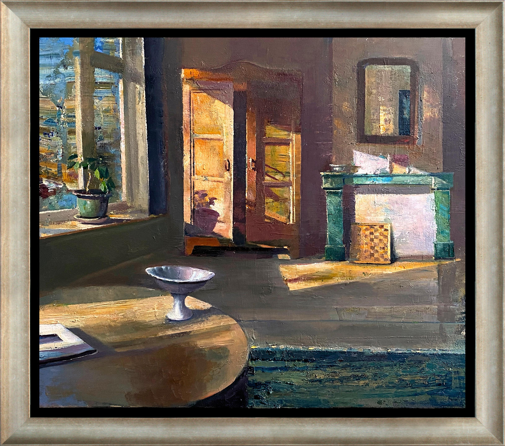 Het schilderij is 37 x 43 cm en voorzien van een zilveren houten baklijst. De totale afmeting is 49 x 55 cm