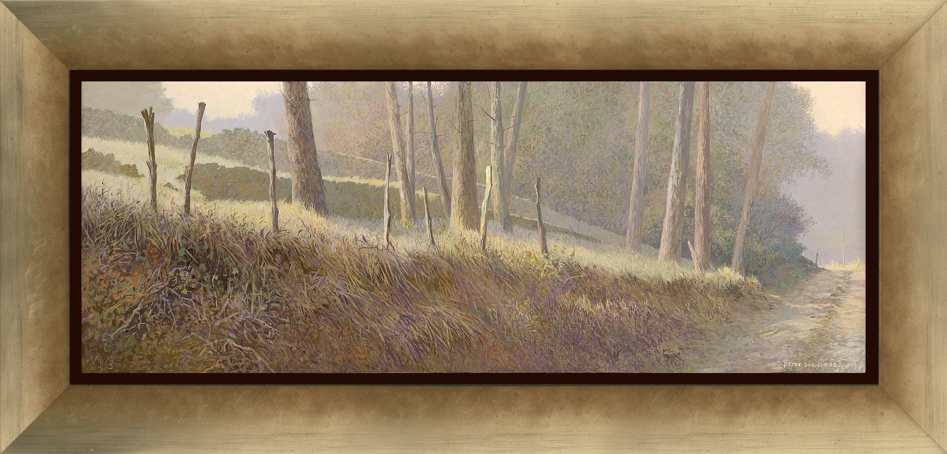 Het schilderij is 15 x 40 cm en voorzien van een gouden houten baklijst. De totale afmeting is 25 x 50 cm