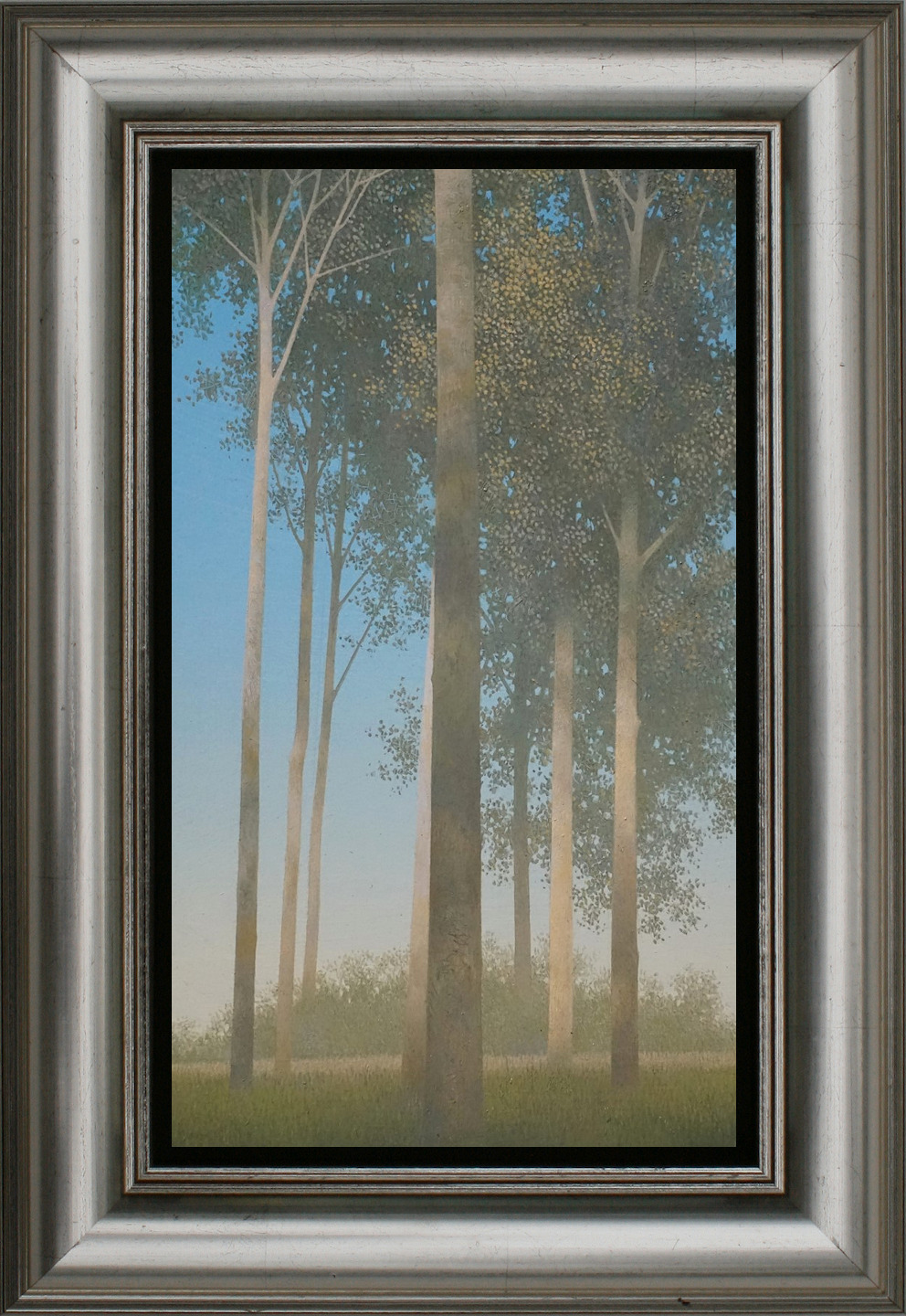 Het schilderij is 22 x 13 cm en voorzien van een ronde baklijst opgelegd met echt zilver. De totale afmeting is 28 x 37 cm