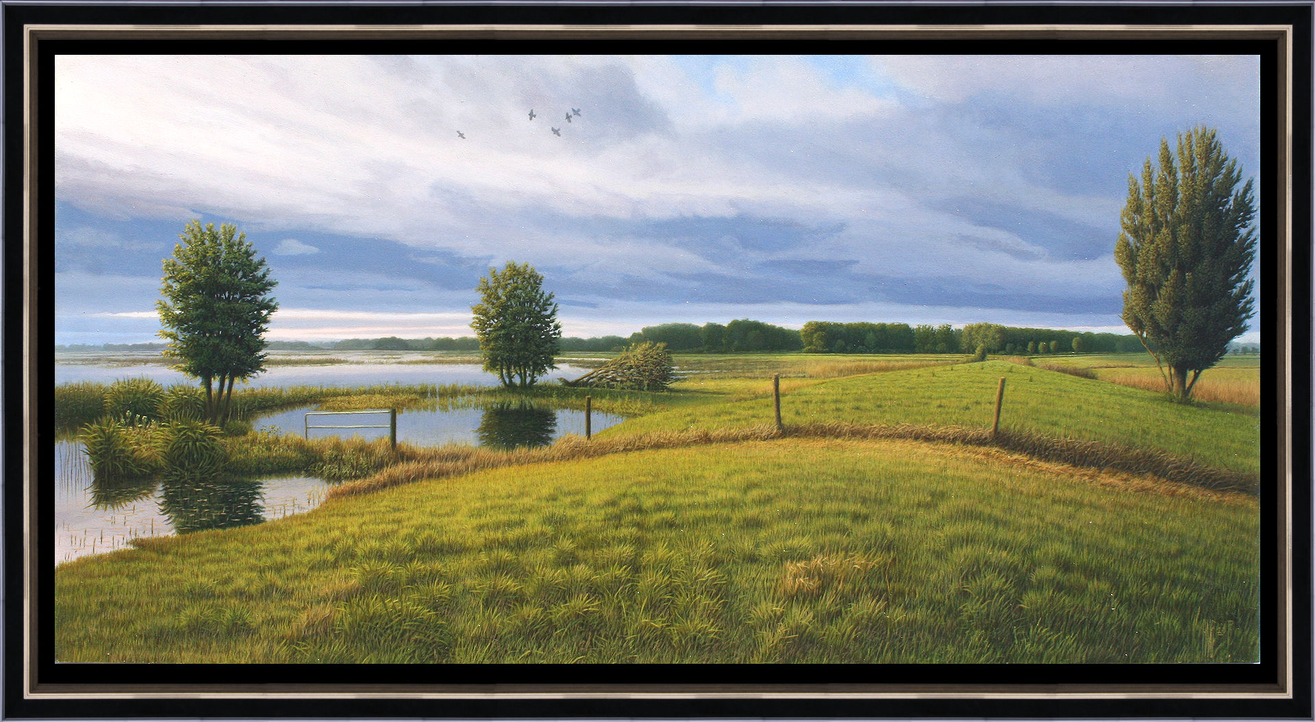Het schilderij is 35 x 70 cm en voorzien van een zwart met zilveren houten baklijst. De totale afmeting is 48 x 83 cm