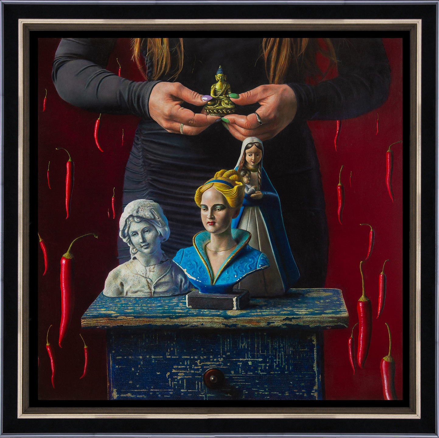 Het schilderij is 50 x 50 cm en voorzien van een zwart met zilveren houten baklijst. De totale afmeting is 63 x 63 cm