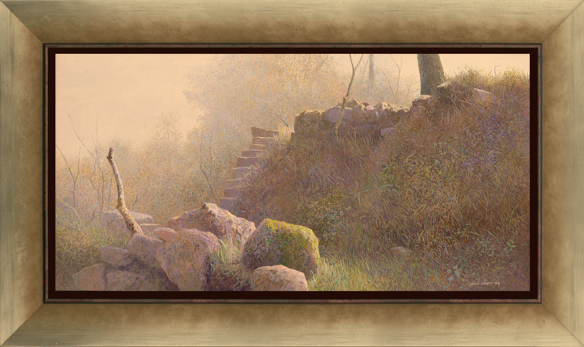 Het schilderij is 20 x 40 cm en voorzien van een gouden houten baklijst. De totale afmeting is 30 x 50 cm