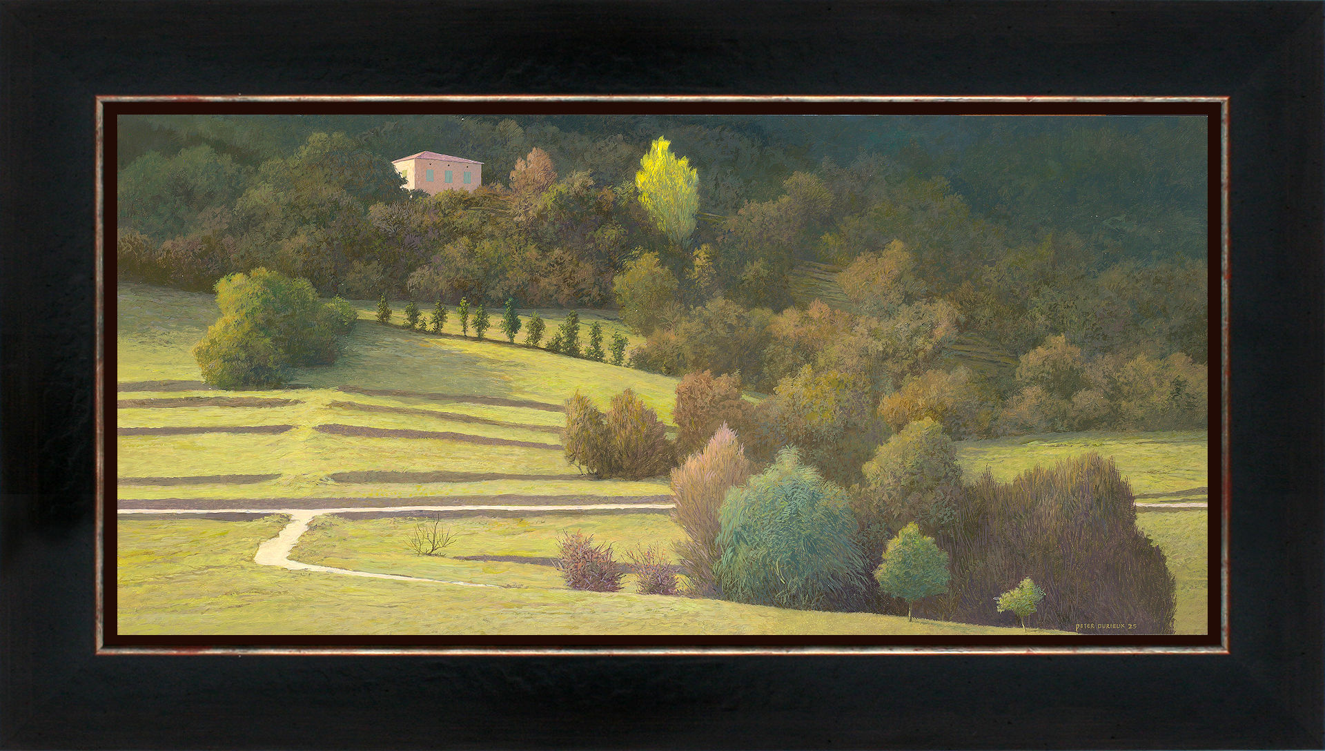 Het schilderij is 24 x 50 cm en voorzien van een zwarte houten baklijst met zilveren binnenrand. De totale afmeting is 34 x 60 cm